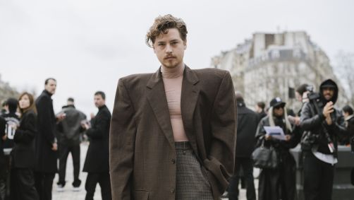 Cole Sprouse aposta em terno over-sized para ir a desfile da Balenciaga