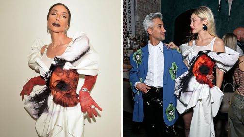 Diferentemente de Maya, que usou o modelito com meia-calça branca e scarpin em tom off-white, Gigi, elegeu o visual básico, durante a divulgação da última temporada de "Next In Fashion", tradicional reality show de moda da Netflix.