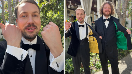 Gints Zilbalodis, diretor de "Flow", compartilhou detalhes de seu look para a cerimônia do Oscar, que acontece neste domingo (2). Bordado em seu terno, ele mostrou desenhos de gatos, assim como na animação, que acompanha um felino. Nas abotoaduras de sua camisa social, outros dois gatinhos foram posicionados.