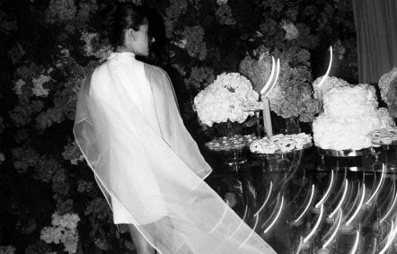 "Usamos organza de seda em um modelo assimétrico, de gola alta e transparência", disse Jade. Para a ocasião, ela usou um vestido curto, na cor branca, coberto por um longo véu.