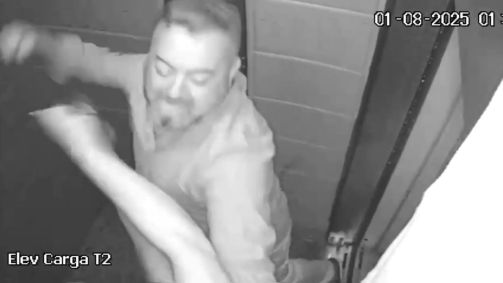 As imagens mostram a vítima acionando o elevador e, assim que as portas se abrem, sendo surpreendida pelo homem, que já a recebe com um soco. Em seguida a mulher o empurra e os dois começam uma discussão.