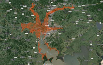 Um mapa produzido por pesquisadores do Instituto de Pesquisas Hidráulicas (IPH) da Universidade Federal do Rio Grande do Sul (UFRGS) mostra uma projeção da situação de momento na Grande Porto Alegre durante a enchente que atinge a região.