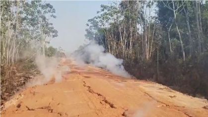 Moradores de Jacareacanga, município no extremo sudoeste do estado do Pará, avistaram fumaça saindo do solo de uma estrada de terra. No vídeo gravado por Ozinaldo Akay, indígena do povo Munduruku, é possível ver a fumaça de rachaduras do chão.