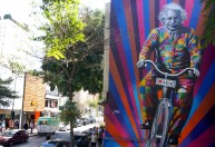 Os painéis estão instalados na ciclofaixa da Paulista. Embaixo de cada obra, há informações sobre a inspiração de Kobra para cada pintura.