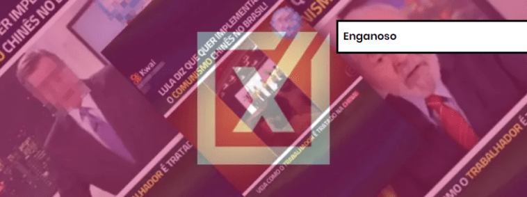 - Enganoso: É enganoso o vídeo que induz ao entendimento de que o ex-presidente Luiz Inácio Lula da Silva (PT) quer implementar o comunismo chinês no Brasil. A publicação faz a junção de trechos de dois vídeos, por meio de edição, para tirar de contexto falas do petista em elogio ao governo de Pequim, durante entrevista concedida a um jornal daquele país, em 2021. A peça de desinformação usa ainda imagens de uma agressão a funcionários de um banco chinês, publicadas em 2016, para sugerir que aquele é o tratamento normalmente dado aos trabalhadores na China.