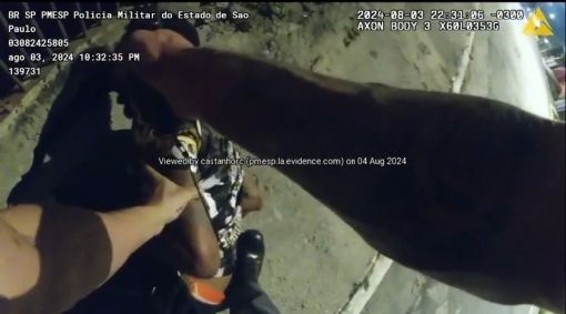 Nas imagens divulgadas da câmera corporal do agente envolvido na ocorrência, é possível acompanhar parte da abordagem do PM enquanto o suspeito já está deitado no chão.