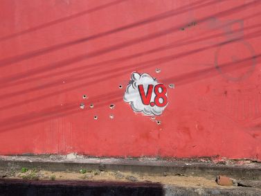 A entrada da comunidade V8 também foi alvo de disparos de fuzil, justamente onde fica o símbolo que a identifica o local, reforçando o cenário de guerra entre facções.