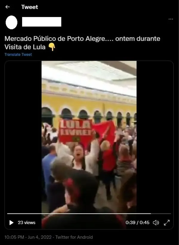 - Conteúdo investigado: Vídeo mostra uma aglomeração de pessoas em suposto protesto contra a presença de Lula e Geraldo Alckmin no Mercado Público de Porto Alegre e, diante disso, questiona a credibilidade das pesquisas eleitorais, que apontam para a liderança do ex-presidente nas intenções de voto.