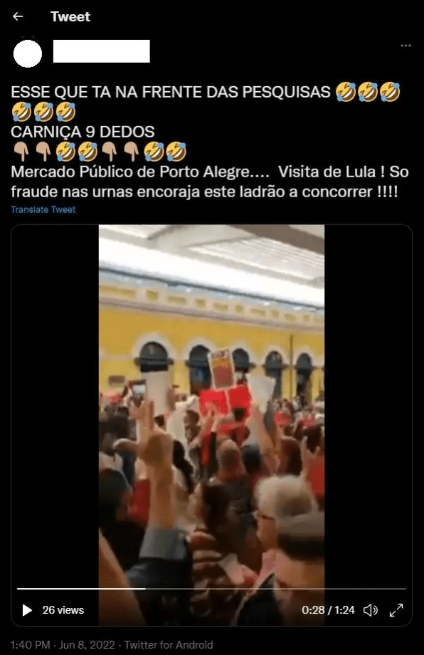 O mesmo vídeo postado no TikTok, aqui verificado, foi publicado por diversos outros usuários do Twitter. As postagens localizadas vão do dia 4 ao dia 8 de junho. Nelas, a qualidade da imagem é superior à postagem do TikTok, o que permite a identificação mais precisa das manifestações também de apoio a Lula. Assim, não se pode valer do vídeo como uma amostra de reprovação da população ao ex-presidente, o que afirma a postagem no TikTok com o objetivo de desacreditar as pesquisas eleitorais que apontam Lula em primeiro lugar nas intenções de voto.