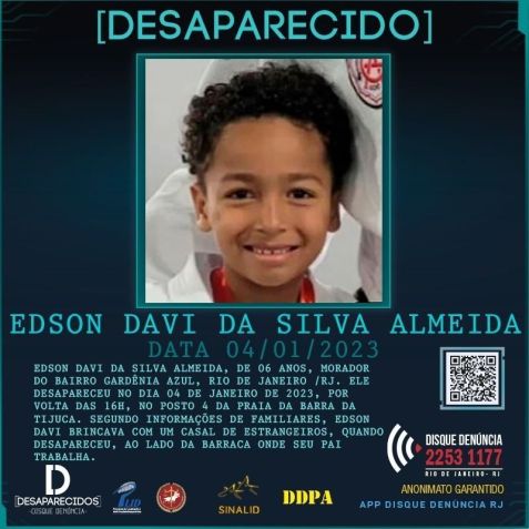 Edson Davi da Silva Almeida, de 6 anos, estava com o pai na praia da Barra da Tijuca quando desapareceu na última quinta-feira (4)