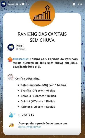 O Instituto Nacional de Meteorologia (Inmet) divulgou a lista das cinco capitais no Brasil com mais tempo sem chuva. Todas acima de 100 dias.