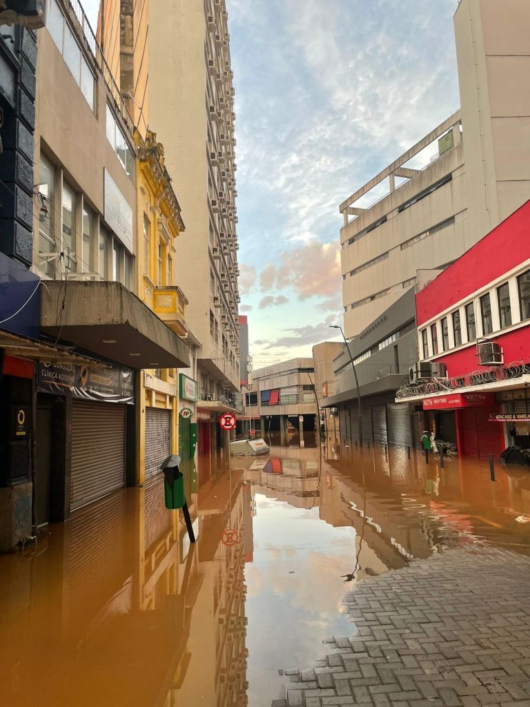Victor está hospedado em um hotel a 400 metros do rio Guaíba. O prédio fica em um morro, o que dificulta a chegada da água, mas ele compartilhou com a CNN uma foto da rua do hotel.