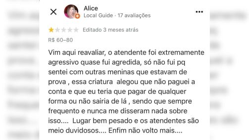 "Essa criatura alegou que eu não paguei a conta e que eu teria que pagar de qualquer forma ou não sairia de lá", disse. “Lugar bem pesado e os atendentes meio duvidosos... Enfim, não volto mais”, escreveu Alice.