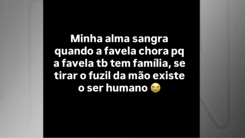 Ele também publicou uma nota no X. "O crime é o reflexo da sociedade o dia que eu ver a favela chorar e não vir aqui falar desse sistema sujo não vou estar sendo eu, minha alma sangra, tirar o fuzil existe o ser humano, eu nunca vou achar normal a polícia entrar em uma favela e matar 70 pessoas quando oque sempre faltou foi oportunidades, favela tem família, favela não é parque de diversão da burguesia, favela é campo de concentração".