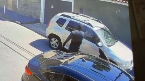 O suspeito estava completamente disfarçado, vestindo roupas pretas, touca balaclava, óculos escuros e luvas. Após o ataque, ele foge e outras pessoas saem da casa para prestar socorro à vítima.
