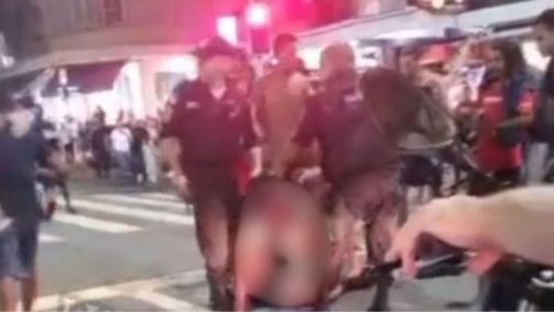 Pouco depois, policiais militares chegam ao local e tentam conter a agressão, afastando os envolvidos.