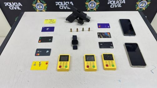 Com ele, foram encontrados três maquininhas de cartão adulteradas, dois celulares, nove cartões de crédito e uma pistola calibre 9 .