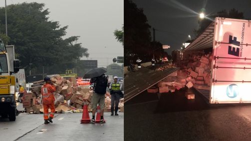 Apesar da tentativa, o condutor acabou batendo em uma mureta de proteção, causando o tombamento e a colisão com outro veículo. A carga ficou espalhada, ocupando três faixas.