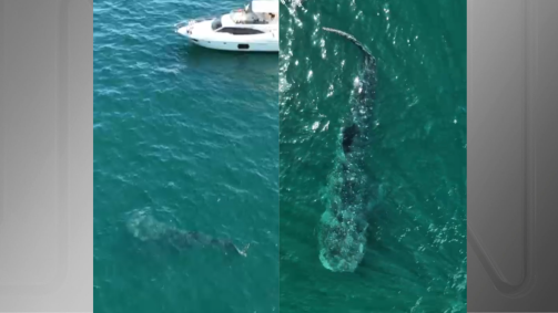 Nas imagens, é possível ver que o animal chega a ser maior do que uma das embarcações que aparece no vídeo. Em outra, um dos fotógrafos mergulha ao lado da baleia.