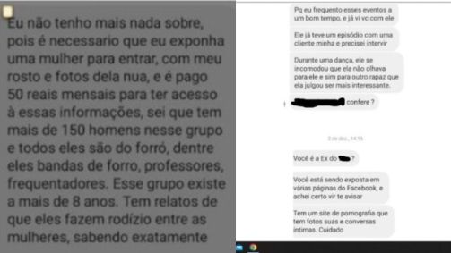 "Eu não tenho mais nada sobre, pois é necessário que eu exponha uma mulher para entrar, com meu rosto e fotos dela nua, e é pago 50 reais mensais para ter acesso à essas informações, sei que tem mais de 150 homens nesse grupo e todos eles são do forró, dentre eles bandas de forro, professores, frequentadores. Esse grupo existe a mais de 8 anos. Tem relatos de que eles fazem rodízio entre as mulheres, sabendo exatamente", afirmou o homem.