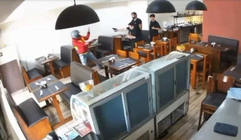 Imagens da câmera de segurança mostram o momento em que o criminoso chega no estabelecimento, estaciona a moto e logo depois anuncia o assalto. Veja a seguir: