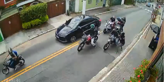 Em um registro de câmera de segurança, é possível ver o momento em que os indivíduos anunciam o assalto, tomam a moto e fogem. Os bandidos também levaram a carteira e o telefone celular da vítima.
