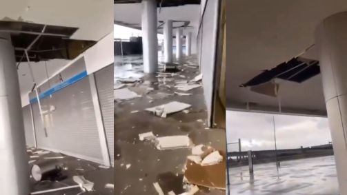 O teto da marquise da esplanada, próximo ao portão A, no lado oeste do estádio, cedeu devido à intensidade dos ventos e da chuva