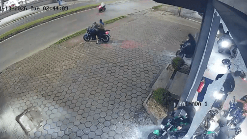 Uma câmera de segurança flagrou o momento da invasão. No vídeo é possível ver os criminosos atirando pedras contra o vidro para poder entrar. Na ocasião, um dos envolvidos fica preso por um momento ao tentar escapar com a moto. Veja abaixo: