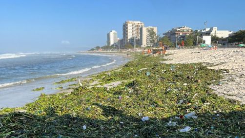 A praia da Barra da Tijuca, na Zona Oeste do Rio de Janeiro, amanheceu nesta quarta-feira (20) repleta de lixo e gigogas, planta que se prolifera em meio a águas poluídas.
