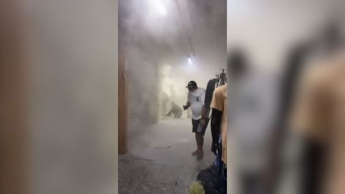 Ainda é possível ver um homem tentando adentrar uma pequena loja, onde o incêndio teria começado. Ele chuta a porta do estabelecimento, mas não consegue entrar.