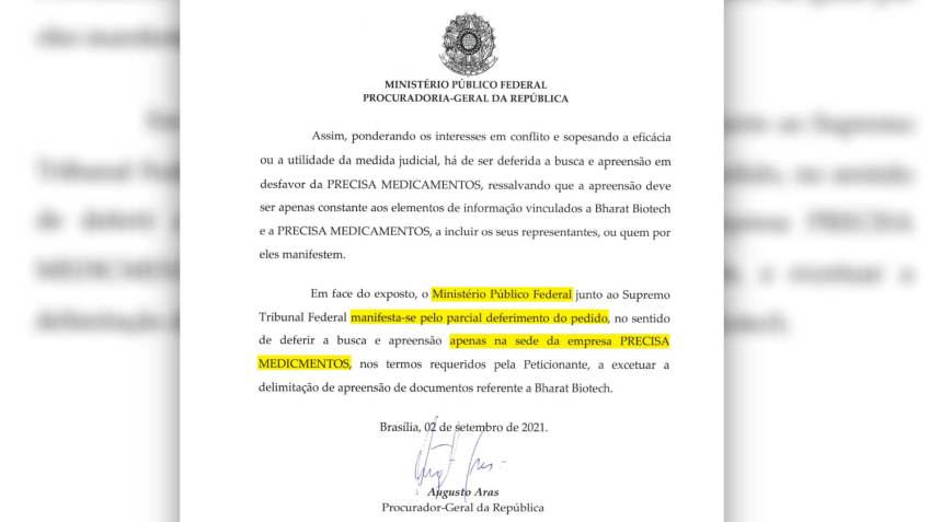 Neste sentido, Aras se manifestou pelo "parcial deferimento do pedido, no sentido de deferir a busca e apreensão apenas na sede da empresa Precisa Medicamentos, nos termos requeridos pela peticonante, a excetuar a delimitação de apreensão de documentos referente a Bharat Biotech".