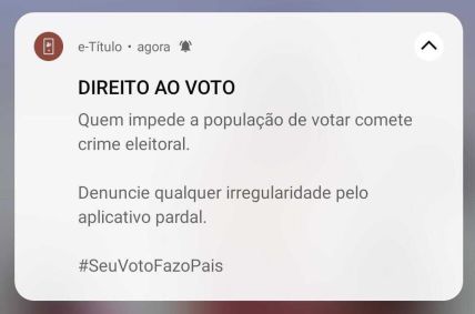 O E-título, aplicativo oficial do Tribunal Superior Eleitoral (TSE) para acesso ao título e informações pessoais dos eleitores, enviou uma notificação aos usuários alertando que ações que impeçam o voto é crime e devem ser denunciadas.