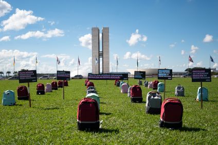 Mochilas são colocadas em frente ao Congresso em ato em defesa do PL das Fake News