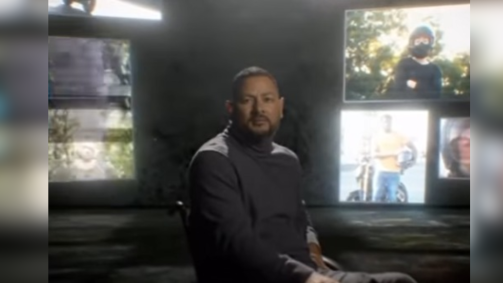 Na peça, uma pessoa que usa cadeira de rodas, ex-motoqueiro, aparece vendo imagens de acidentes envolvendo motos.