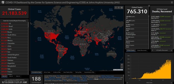O mundo já superou a marca de 21 milhões de casos de Covid-19, doença causada pelo novo coronavírus. A contagem é feita pela universidade americana Johns Hopkins, que atualiza painel em tempo real com números da pandemia.