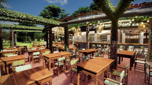 Em forma de um terraço aberto, o salão conta com 540 metros quadrados e foi pensado para integrar com o verde local. A ambientação segue a mesma linha, com móveis construídos com as madeiras de árvores caídas do próprio parque. Em um dos lados, paralelo ao deque de madeira reflorestada, há um pequeno lago que trará ainda mais a sensação de estar no meio da floresta.
