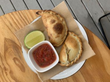 A massa amanteigada ganha uma crocância extra servida diretamente do forno a lenha. A de cogumelos e queijo é feita com cogumelos variados colhidos na região; a gallega de brótola leva peixe envolto em um molho de pimenta e tomate; e a de cordeiro ganha uma leve caramelização na massa à medida que a carne, com um pouco de limão, é assada diretamente dentro da empanada.