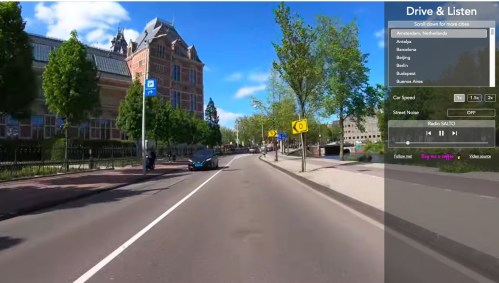 Passeio virtual de carro pelas ruas de Amsterdã, na Holanda. No canto direito, detalhes da lista de cidades e comandos do site (Foto: reprodução/driveandlisten.herokuapp.com)